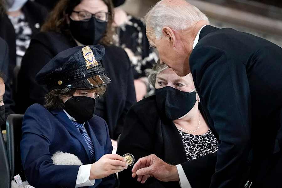 Two of Evans’ children clutched stuffed animals as the gazed at their father’s flag-draped coffin, one wearing his father’s police uniform hat. At one moment, a toy replica of the U.S. Capitol was dropped; Biden reached over to pick it up.