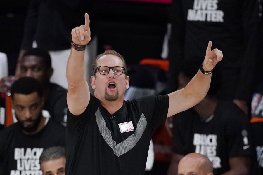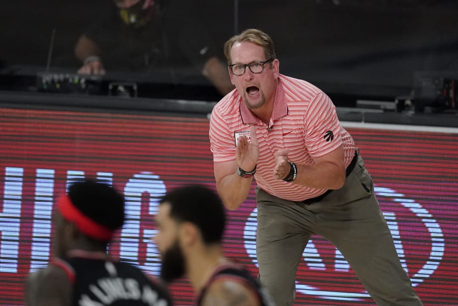 Toronto Raptors' head coach Nick Nurse directs his team during the first half of an NBA conference semifinal playoff basketball game with the Boston Celtics Monday, Sept. 7, 2020, in Lake Buena Vista, Fla. (AP Photo/Mark J. Terrill)