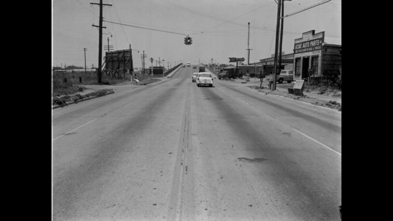 Looking West at the intersection of Beaver and Acorn Streets in 1959. New Town's former W.H. Clark Fruit Company citrus packing house can be seen to the right of the Beaver Street viaduct (above).