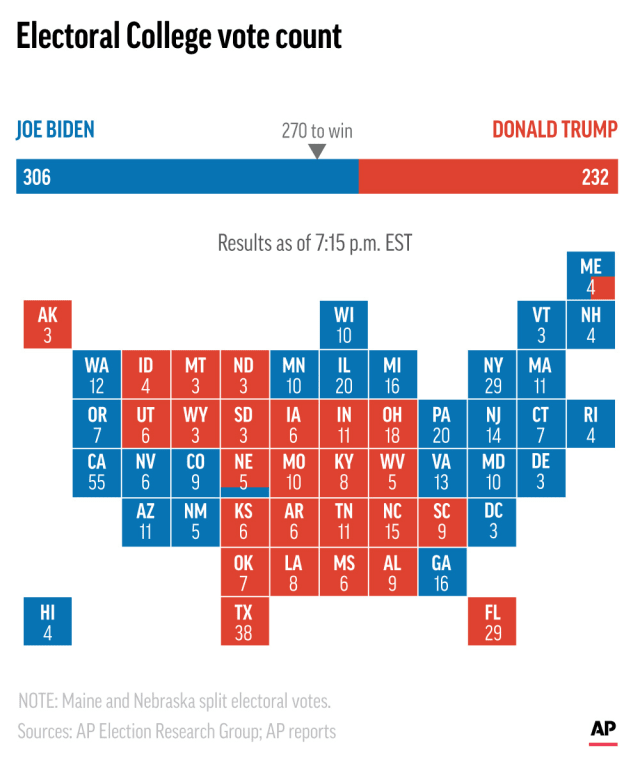 The presidential electors on Monday gave Biden a solid majority of 306 electoral votes to Trump's 232, the same margin that Trump bragged was a landslide when he won the White House four years ago.