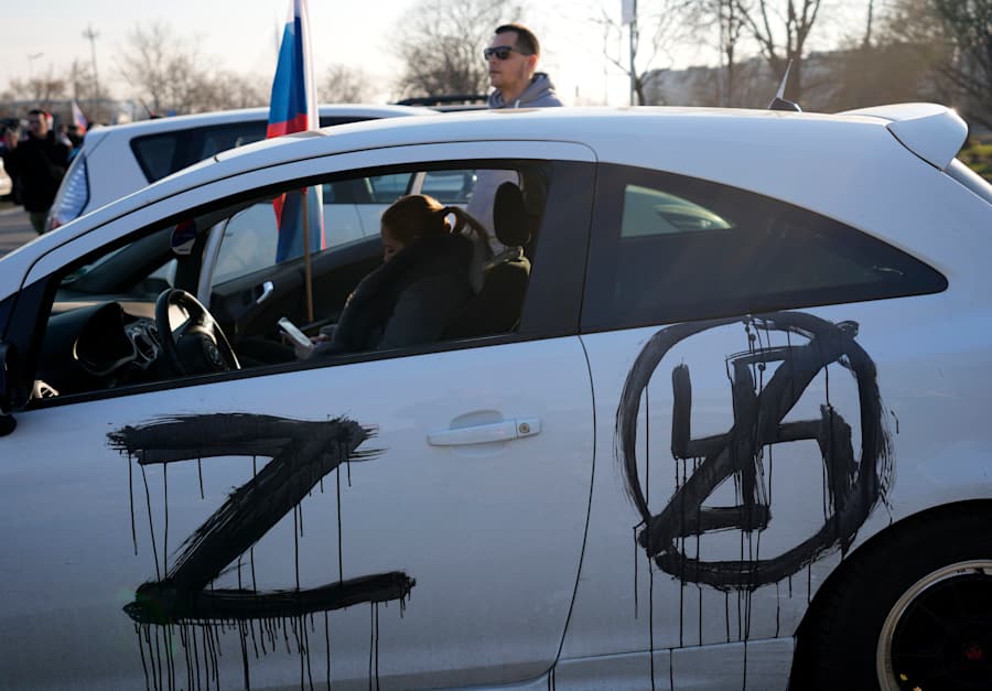 The occupants waved Russian and Serbian flags, honked horns and chanted pro-Putin slogans. Some cars had the letter Z painted on them — a symbol of support for the Russian president.