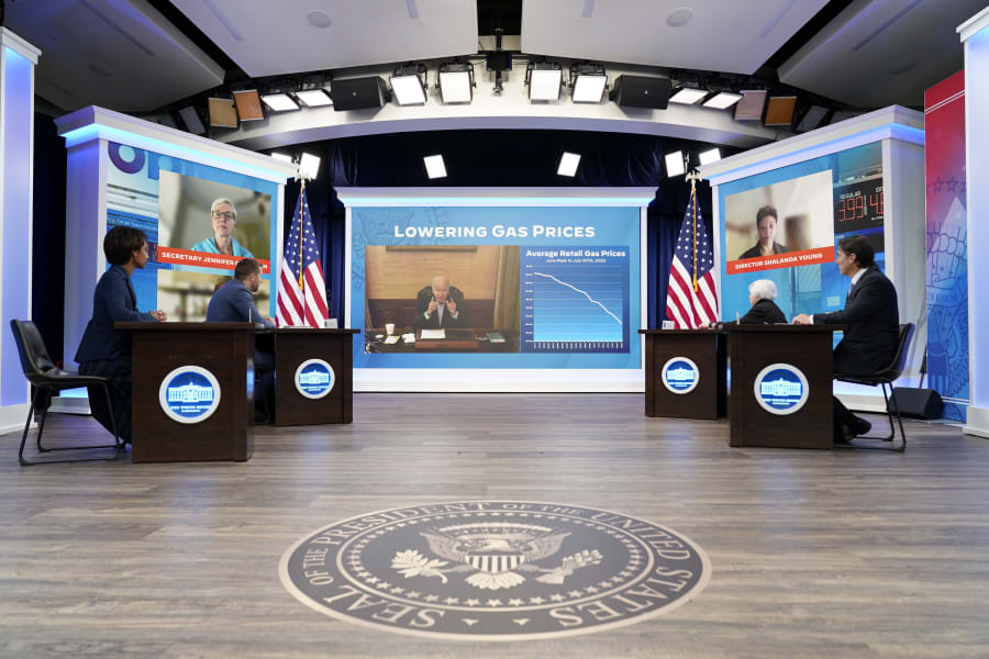 As he beamed into a virtual meeting from the Treaty Room, Biden took off a mask and sipped water as he began discussing the decline in gas prices in recent weeks. Reporters were allowed to view a few minutes of the proceedings and, when they asked how Biden was feeling, he flashed a thumb’s up — although he was audibly hoarse and coughed a handful of times.