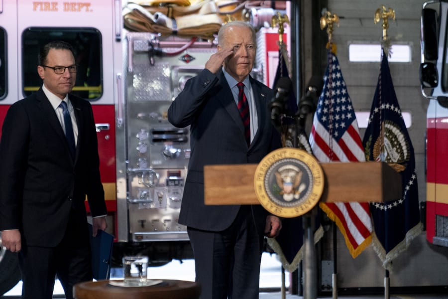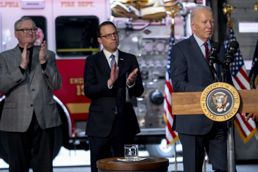 Earlier, standing in Engine 13 Firehouse, Biden and Philadelphia leaders clapped as the truck hoisted up a ladder and the call went over the radio: “Ladder 1 has officially returned to service.”