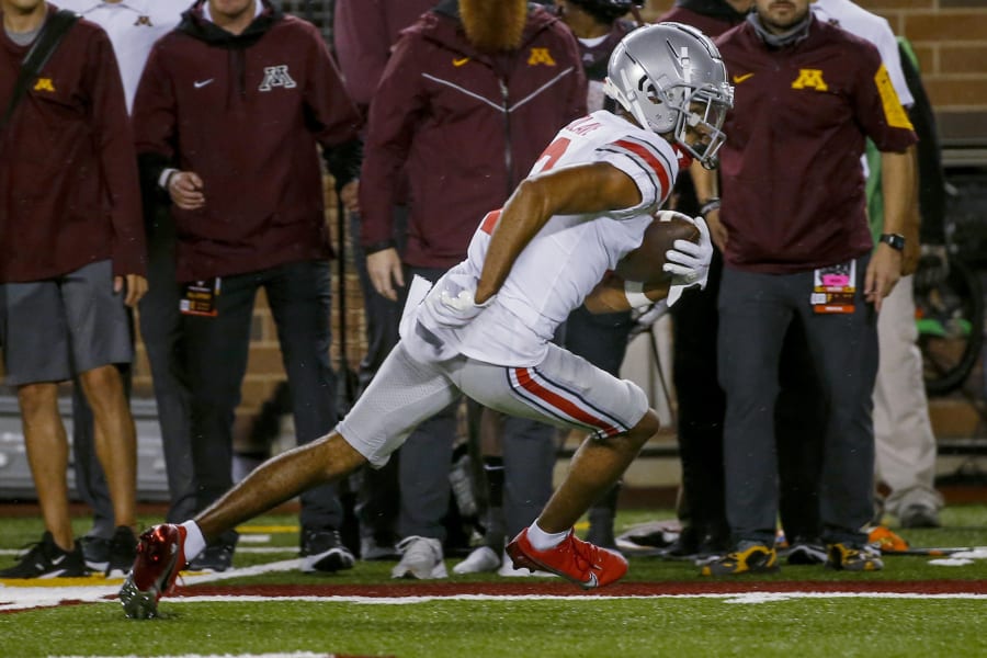 Chris Olave had touchdown catches of 38 and 61 yards, and Garrett Wilson scored on a 56-yard reception that gave Ohio State the lead for good at 24-21 midway through the third quarter. Less than three minutes later, Haskell Garrett grabbed a fumble from a strip-sack that Zach Harrison delivered on Tanner Morgan and ran it in for a 32-yard touchdown.
