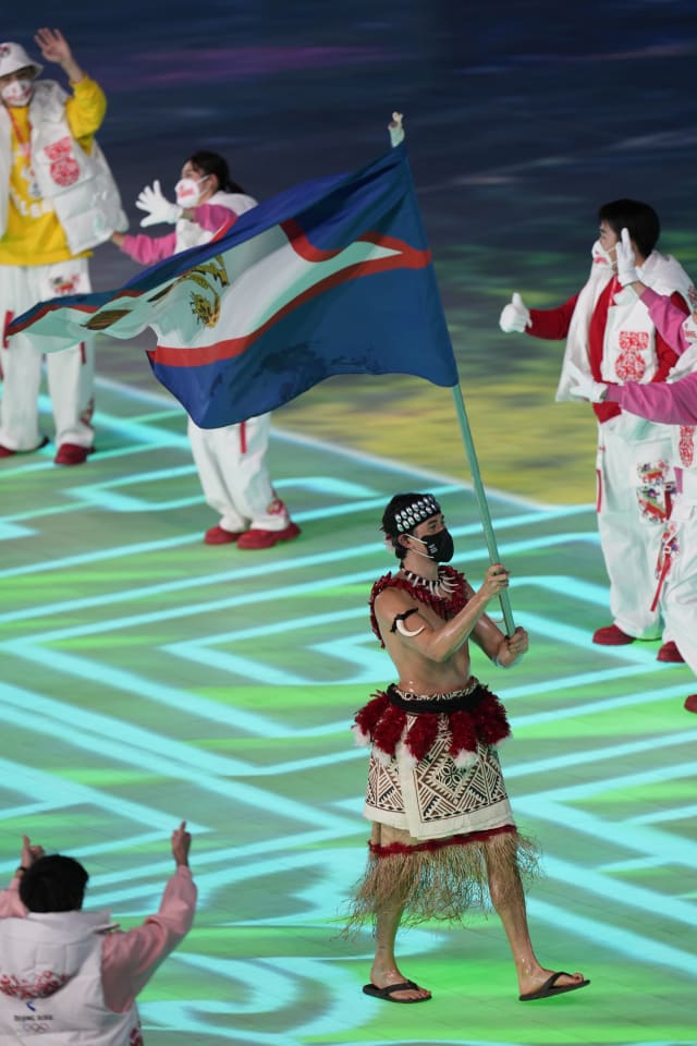 Crumpton carried the (shirtless) flag. He also competed for American Samoa in track and field at the Tokyo Games last summer. His mother's family background allowed him to switch his athletic allegiance to American Samoa in 2019.