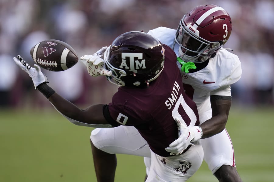 The Crimson Tide’s Caleb Downs intercepted a pass in the third quarter two plays after A&M got an interception of its own. Alabama’s Chris Braswell blocked A&M’s 42-yard field goal attempt in the fourth quarter and returned it for an apparent touchdown, only to have the score wiped out by a penalty.