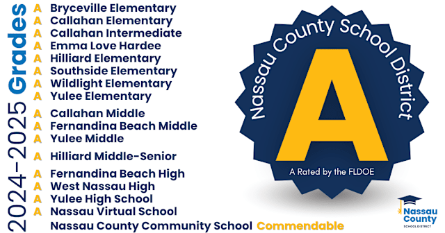Read full article: All 14 schools in Nassau County received an ‘A’ rating for the 24-25 school year; district ranked No. 1 for entire stateThe Nassau County School District made history in the 2024-2025 school year. Based on the latest rankings released by the Florida Department of Education (FLDOE), Nassau County was ranked the number one school district in Florida, earning an “A” rating for every single school in the district.