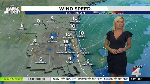 Read full article: Jacksonville coast faces more gusty winds, spotty showers, pop up stormsJacksonville faces continued windy conditions along the coast with strong gusts, a chance of showers and storms, and warmer temperatures expected later in the week, according to News4JAX's meteorologist and The Weather Authority's Exact Track 4D forecast.